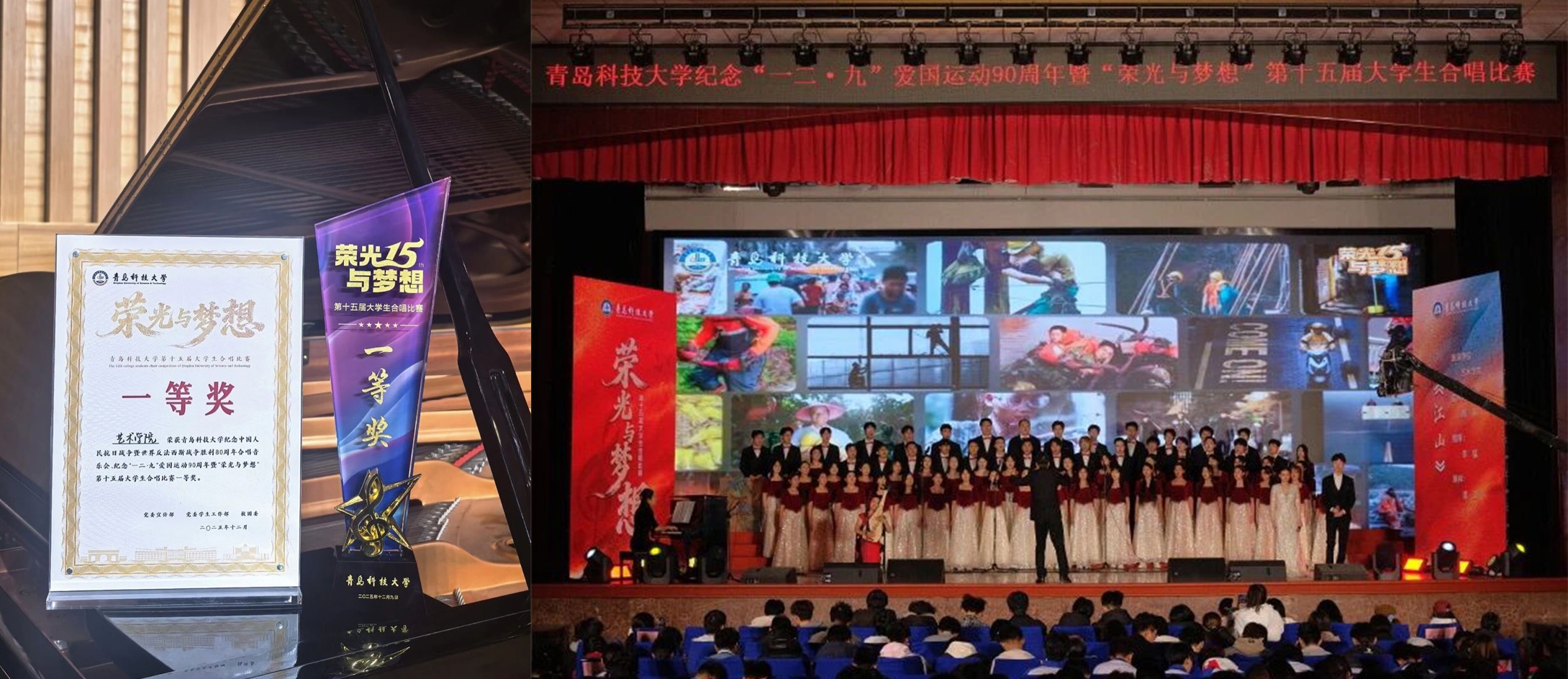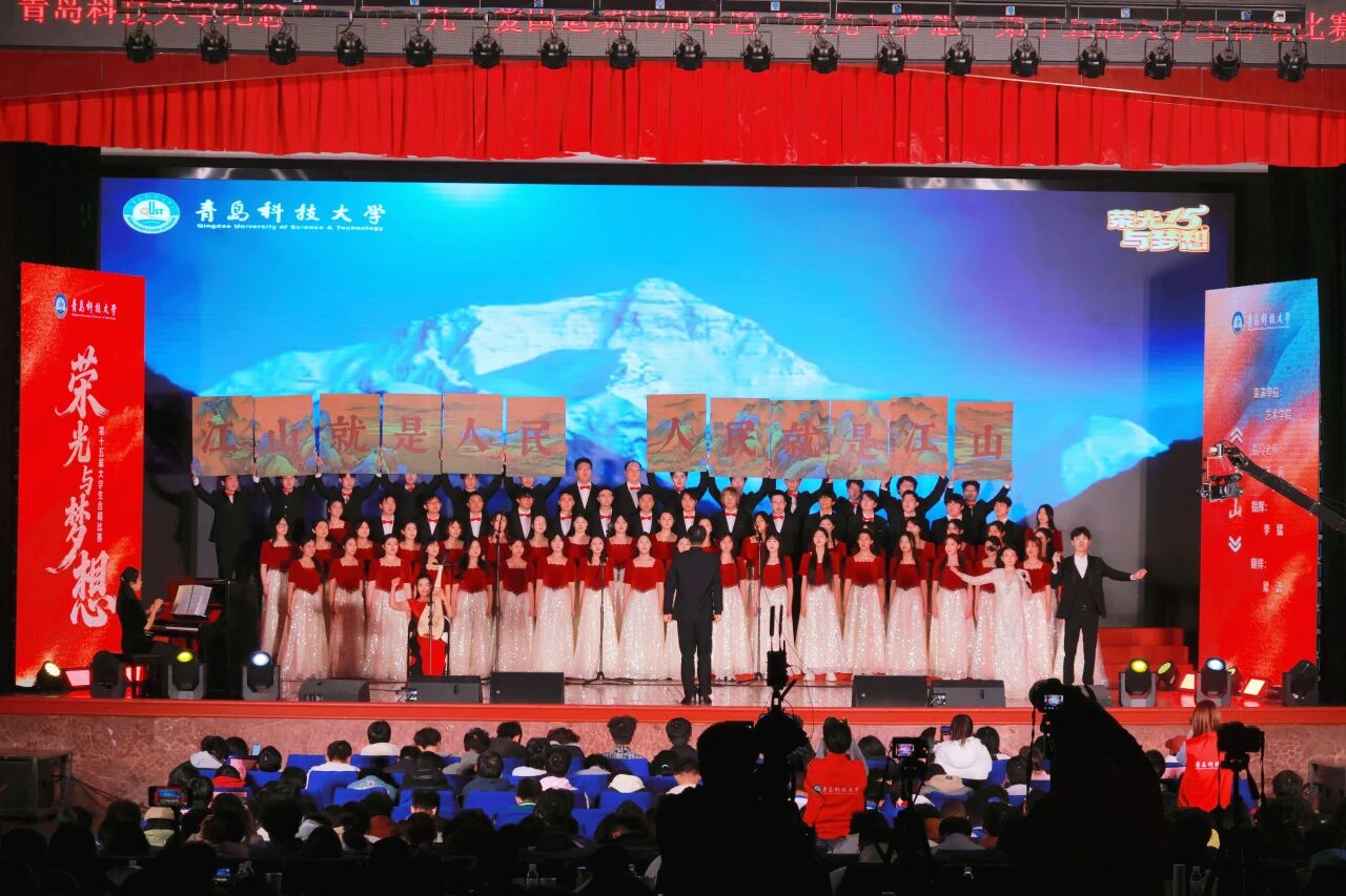 12月9日下午,青岛科技大学纪念“一二·九”运动90周年音乐思政课暨第十五届大学生合唱比赛决赛在四方校区西礼堂圆满落幕。艺术学院师生合唱团凭借一曲气势恢宏的《江山》惊艳全场,以卓越的艺术表现力、真挚深沉的情感表达和完美的舞台呈现,获得评委一致认可,连续三年斩获一等奖。