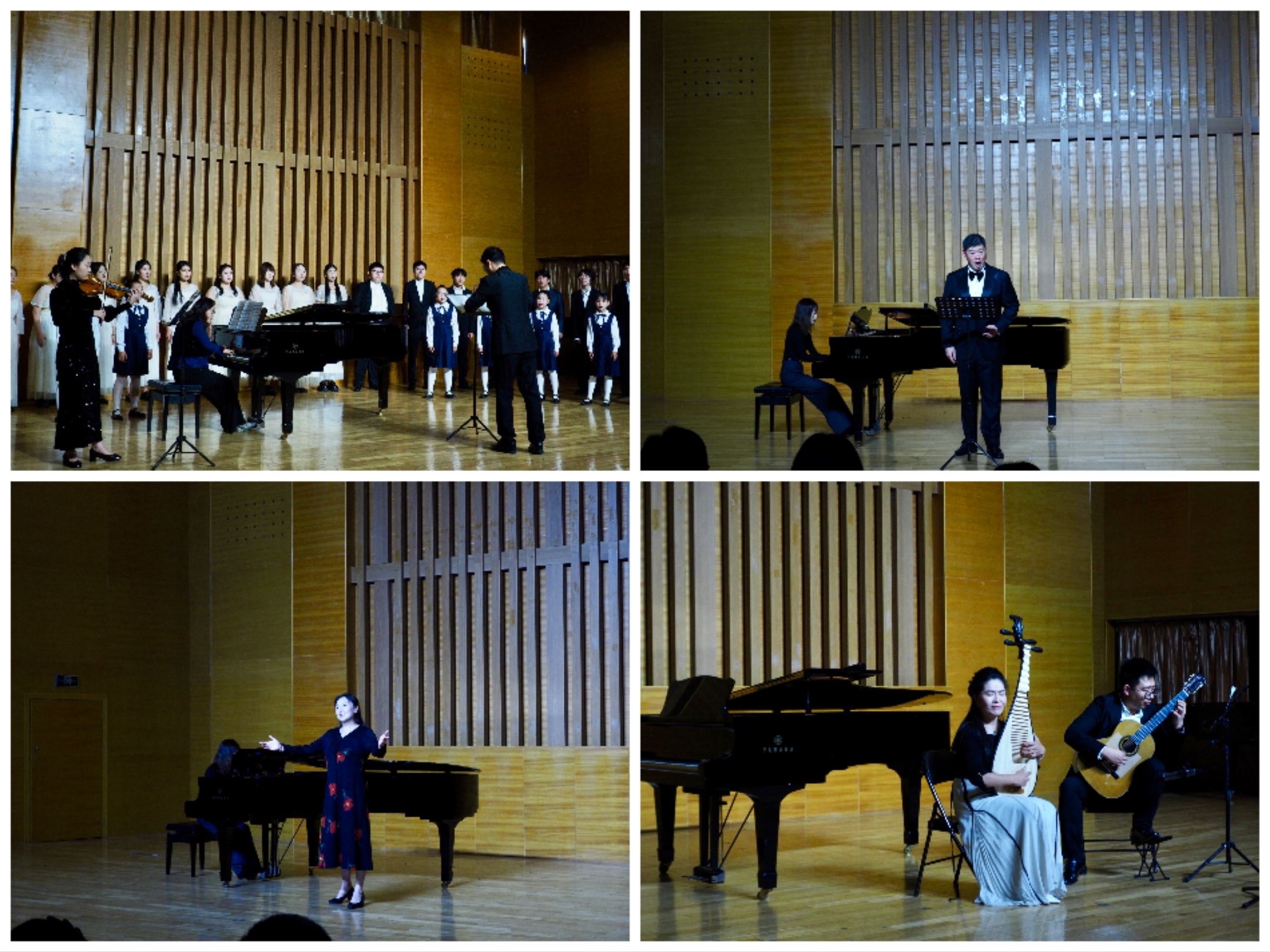 音乐会在“明德”合唱团演唱的德国艺术歌曲《野玫瑰》与《乘着歌声的翅膀》中拉开序幕,这支汇聚了艺术学院音乐系、外国语学院德语系、中德科技学院、中德工程学院以及合作学校崂山区第三实验小学学生的合唱团,展现出跨专业、跨年龄的多元声音效果。音乐系师生先后演唱了舒伯特艺术歌曲《菩提树》、《纺车旁的玛格丽特》、《春梦》,理查·施特劳斯艺术歌曲《万灵节》,莫扎特歌剧咏叹调《多么美好的肖像》,中国艺术歌曲《玫瑰三愿》等。古典吉他演奏出的巴赫经典作品,与琵琶合作演奏的《忆江南》成为音乐会的亮点,吉他的细腻与琵琶的典雅相融合,展现出扣人心弦的魅力。