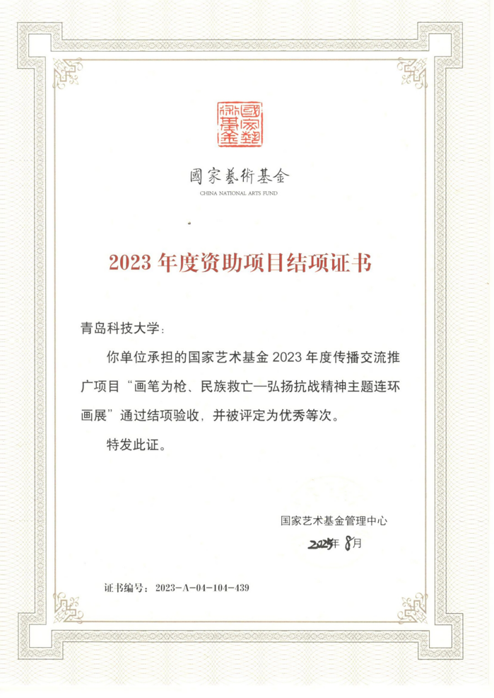 近日,国家艺术基金2023年度传播交流推广资助项目“画笔为枪、民族救亡——弘扬抗战精神主题连环画展”顺利通过结项验收,并获评优秀等次。该项目由艺术学院主导实施,项目负责人禹青领衔团队,历经两年巡展,以艺术之力传承红色基因,取得显著社会成效。