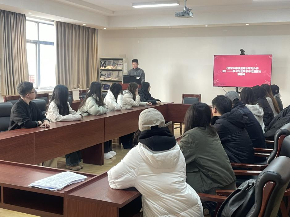 11月10日,艺术学院研究生会于艺术学院213会议室召开了《坚定不移推进高水平对外开放》学习习近平总书记重要文章读书分享会,学院全体研究生骨干参会。