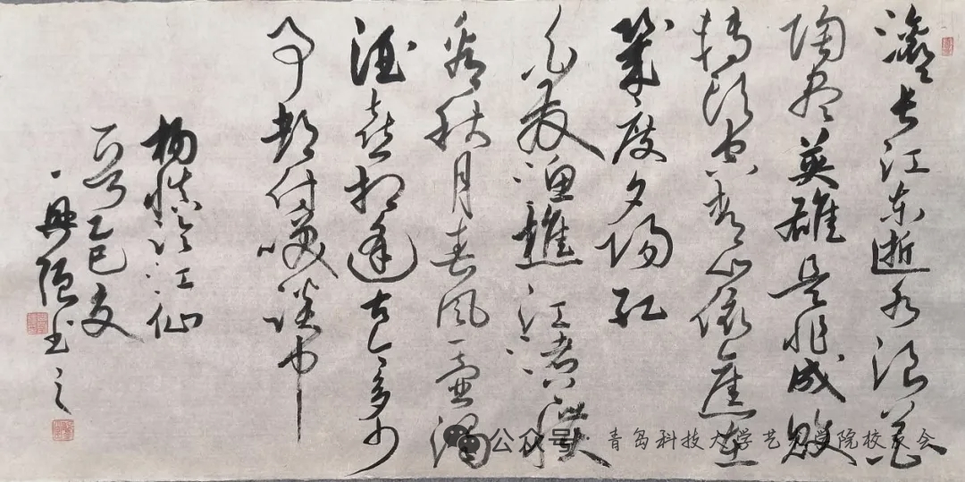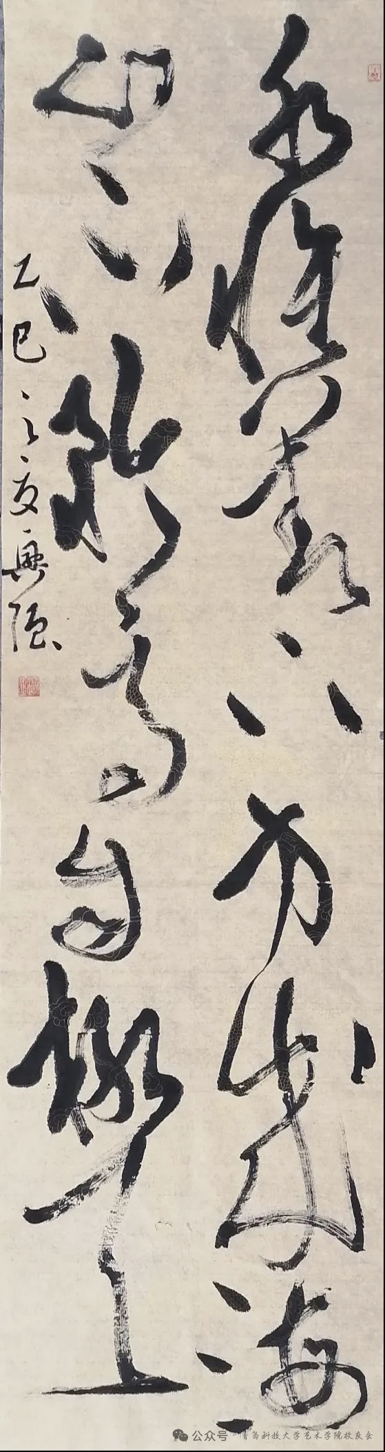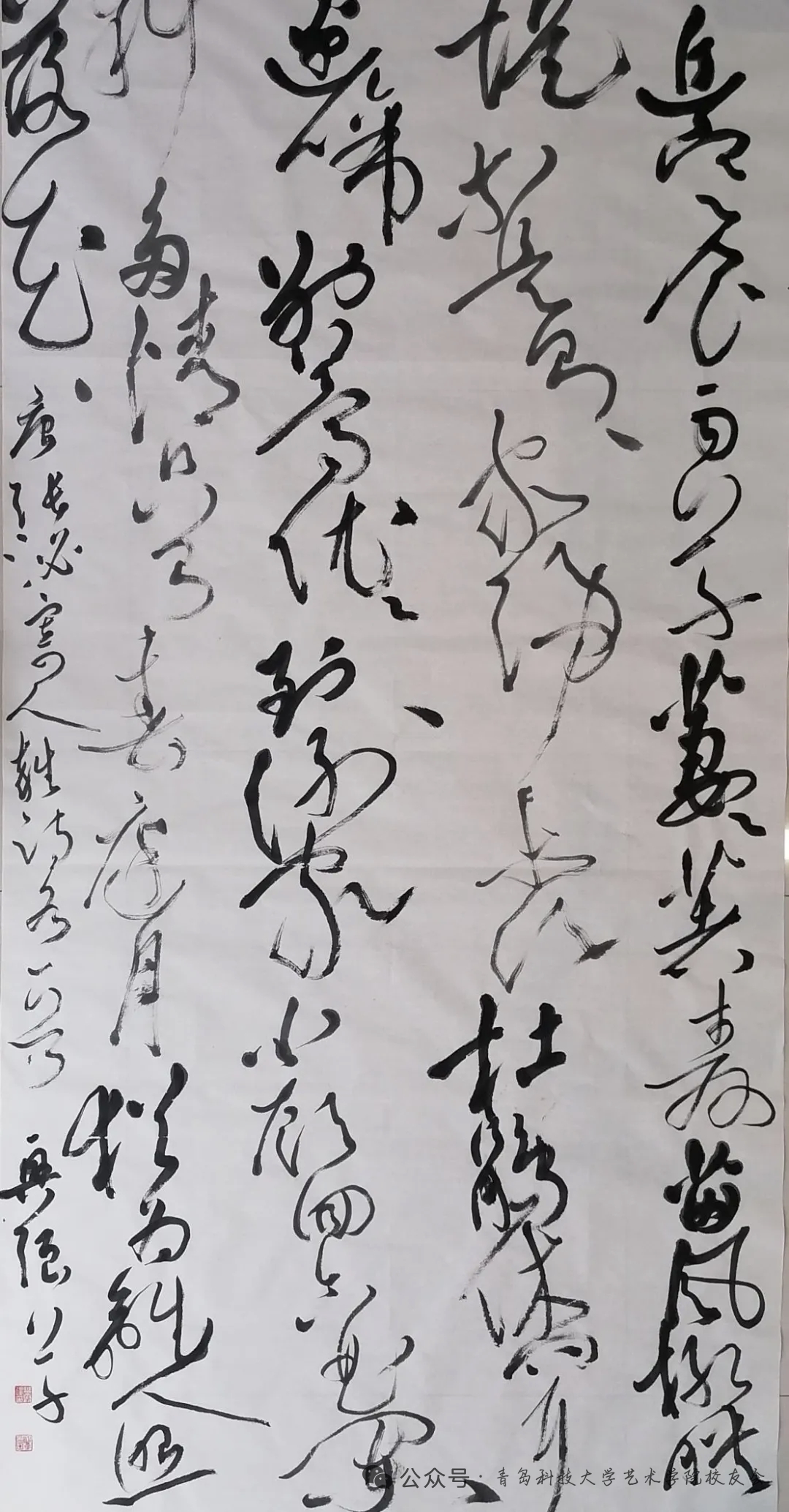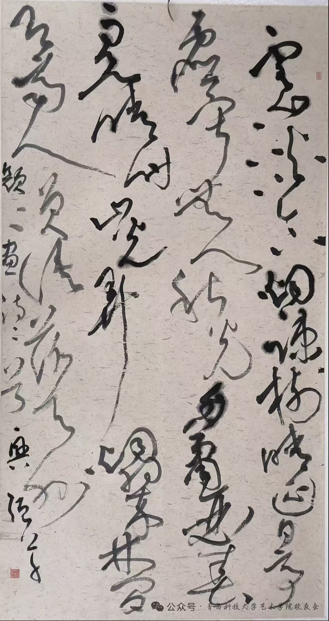 其书法创作,更是将“妙机其微”展现得淋漓尽致。他主攻草书,深谙“达其情性,形其哀乐”的精髓。展卷观之,飞舞的线条似有生命,时而如惊涛拍岸,汹涌澎湃;时而似小桥流水,温婉细腻。这些看似肆意奔放的笔触,实则暗藏玄机:每一处转折、每一笔牵丝,都经过深思熟虑与反复锤炼。他巧妙融合楷书的端庄严谨、隶书的古朴厚重,在狂放与规矩间寻得精妙平衡。提笔落墨间,他敏锐捕捉笔墨与纸张接触的瞬间变化,依心境与节奏赋予线条丰富层次——墨色浓淡交织,恰似阴阳流转;线条粗细变化,宛若四季更迭。观者在笔墨游走间,能真切感受到他对艺术精微之处的精准把握。